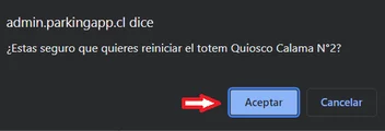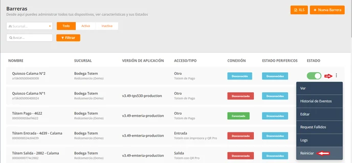 3- Se desplegara un lista con todos los equipos T贸tem de tu estacionamiento, aqu铆 deber谩s pinchar en los tres puntos y luego en Reiniciar.