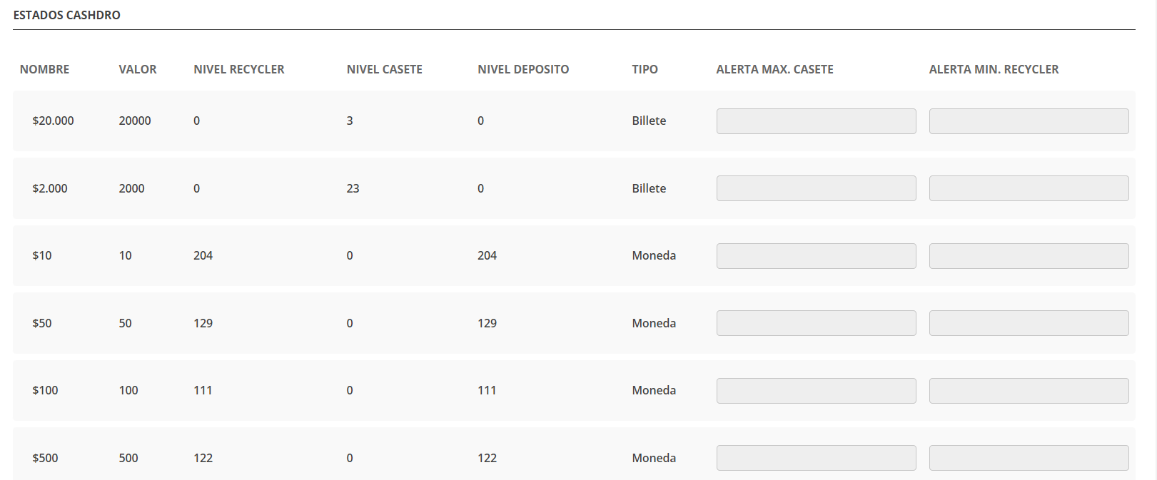 Aqu铆 veras la cantidad de billetes o monedad que hay en el Recycler, en el Casete y en el Deposito adem谩s de poder definir alertas m谩xima de Casete o m铆nimas de Recycle.